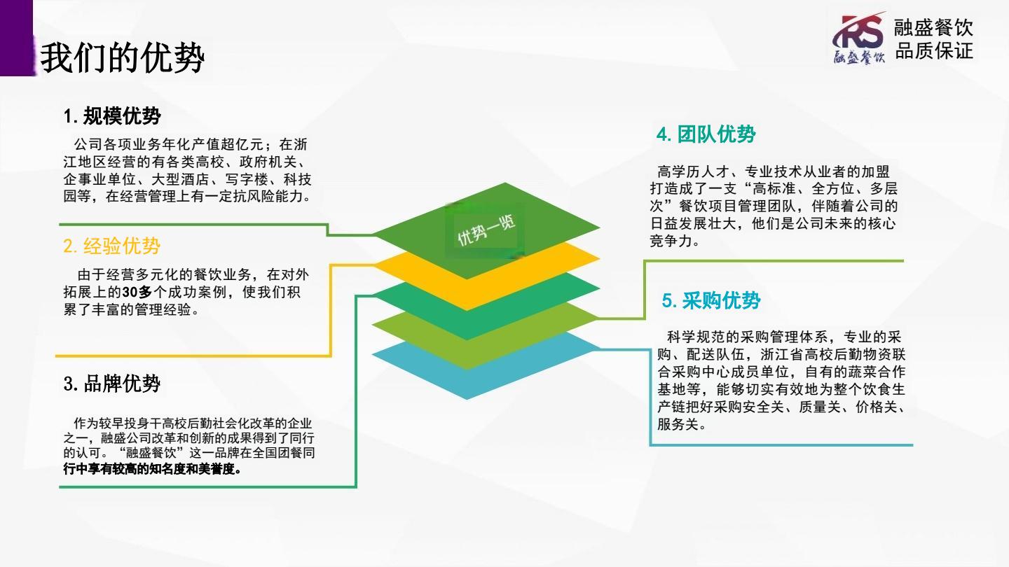 浙江融盛餐饮管理有限公司成立于2008年,是家中型餐饮企业,我们拥有一支年轻的餐饮团队。服务范围;各大高校,中小学食堂,企业事业单位食堂,写字楼食堂。目前服务单位;浙大城市学院,浙江大学工程师学院,浙江树人学院(拱宸桥校区,杨汛桥校区)武义县中医院食堂,杭州市欣瑞食堂,吉瑞食堂,浙江正泰电器股份有限公司乐清园区,我们以高质量的服务我客户优质的餐饮服务体验。